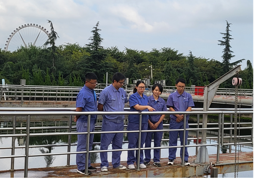 图为唐思奇(左三)与水厂技术骨干研究污水处理技术